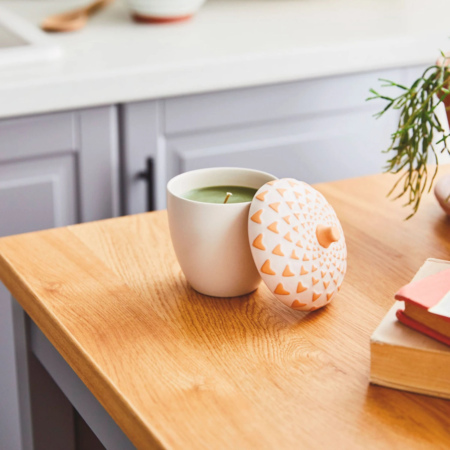 • Acorn-shaped ceramic jar with lid features soy-blend wax, single-wick scented candle.