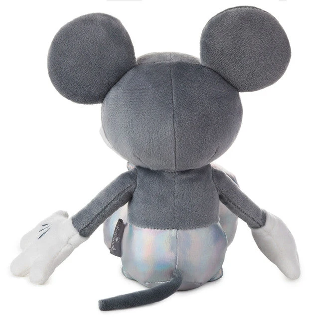 Disney Mickey Mouse soft plush stuffed animal in platinum gray, white and iridescent fabrics features embroidered accents and a commemorative Disney 100th anniversary patch.