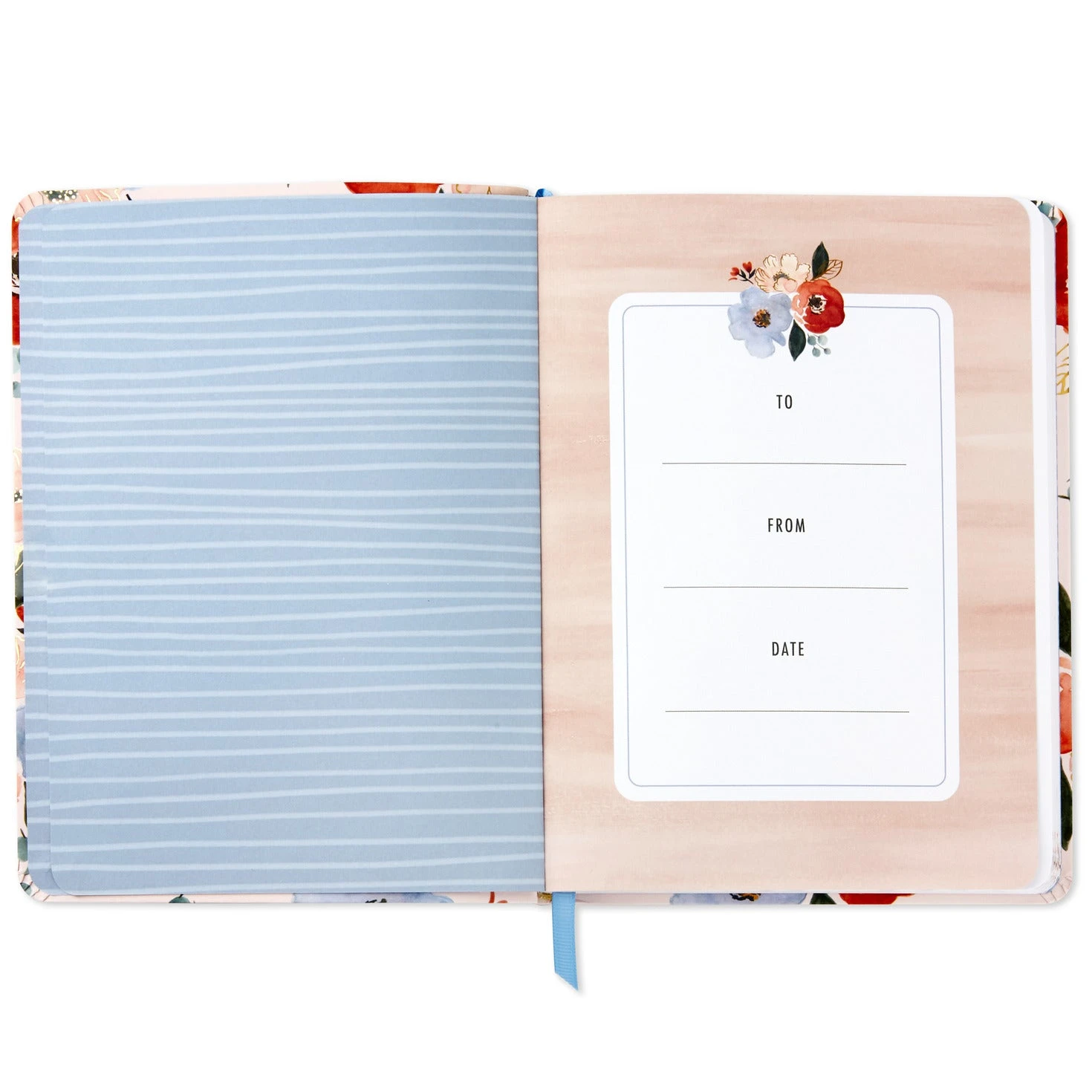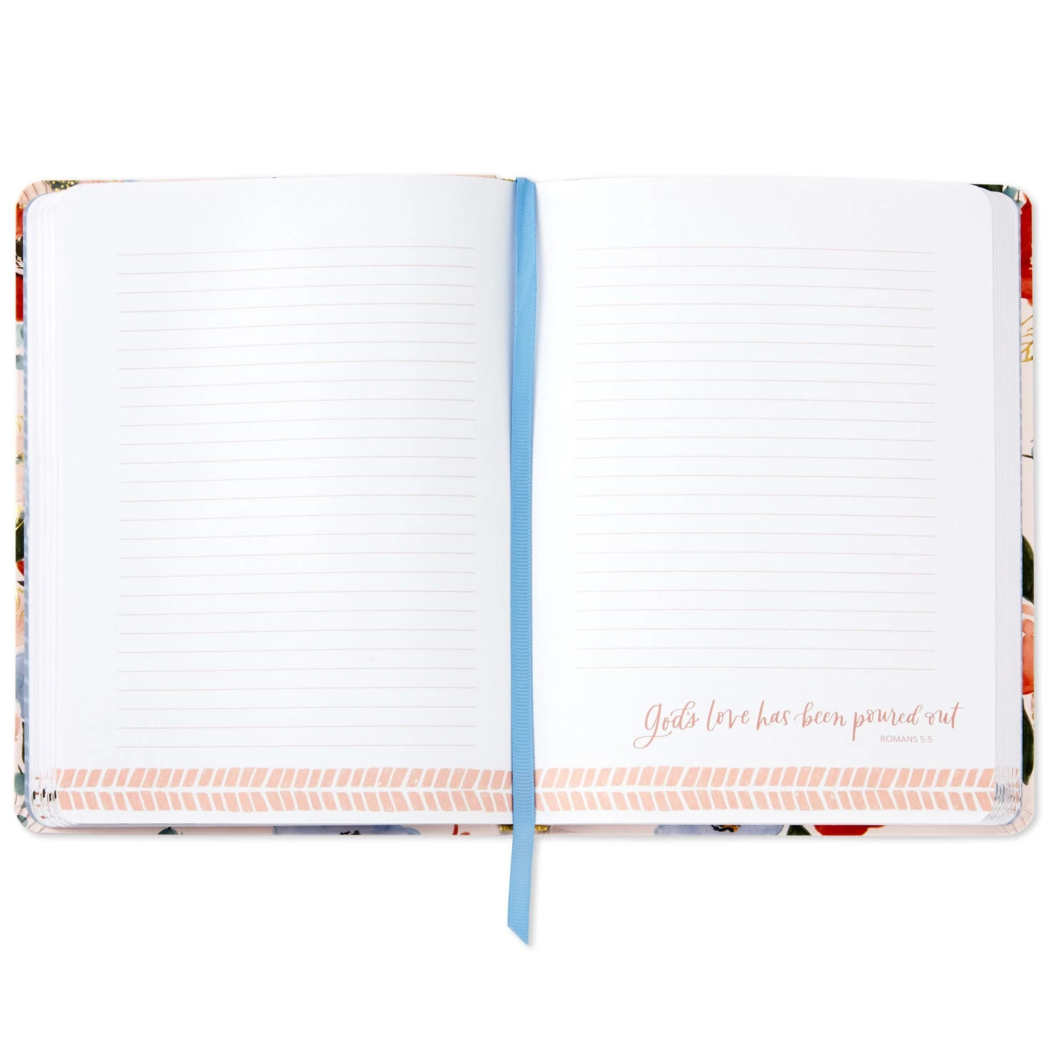 Hardcover notebook features Bible verses on lined pages for journaling.