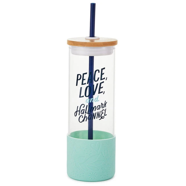 Hallmark Channel glass water bottle features a fun quote, bamboo lid, plastic straw and silicone base.