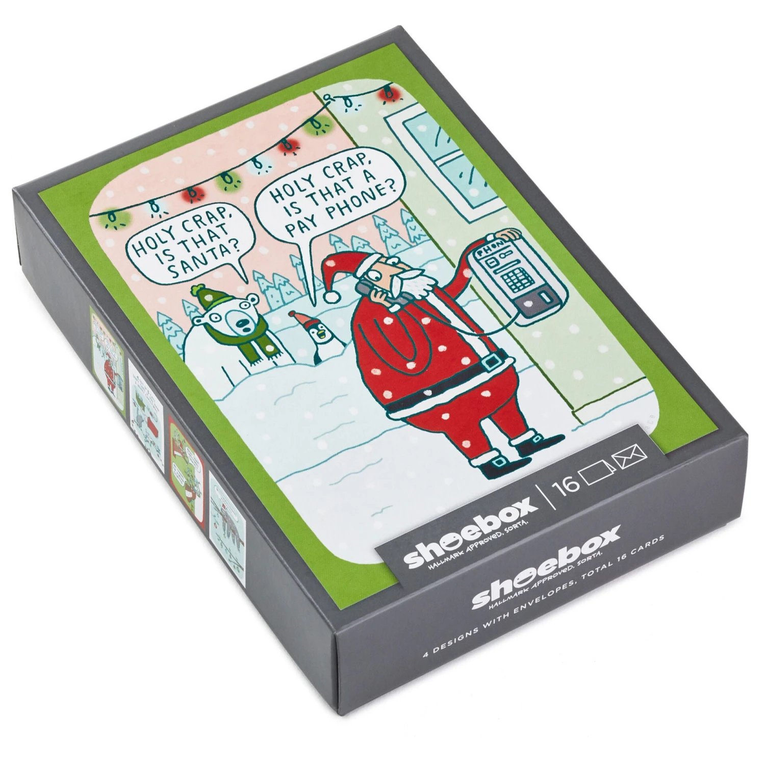 Funny boxed Christmas cards assortment features four humorous designs including Santa on a pay phone, cats playing with Christmas decorations, a festive sloth and a pair of reindeer mounted on a wall. This multipack of holiday cards is perfect for sending season’s greetings to friends, family and loved ones.