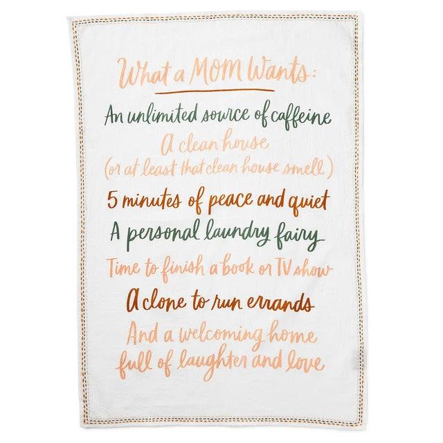 On towel: What a Mom Wants: An unlimited source of caffeine. A clean house (or at least that clean house smell). 5 minutes of peace and quiet. A personal laundry fairy. Time to finish a book or TV show. A clone to run errands. And a welcoming home full of laughter and love.